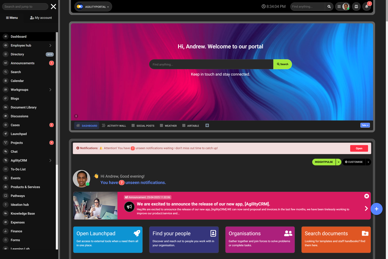 AgilityPortal is a next-generation digital workplace platform created to bring employees together, no matter where they are.