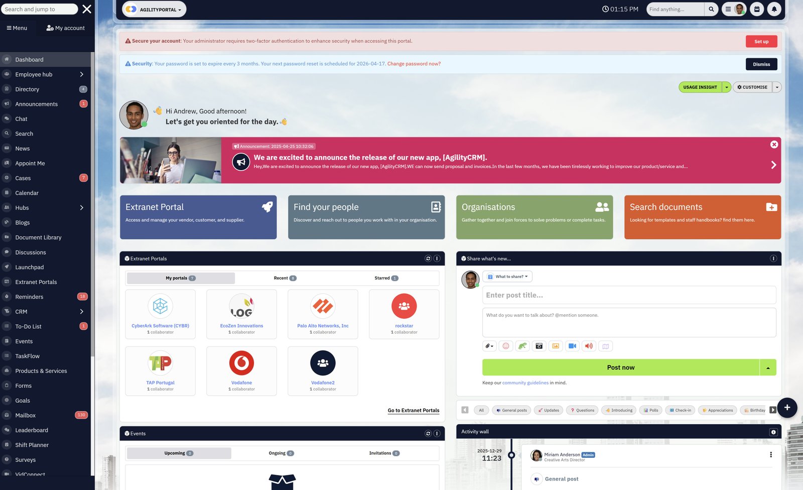 AgilityPortal supports internal communication by: